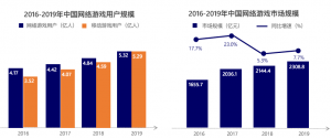 2019年中国游戏市场规模达2308.8亿元,同比增速7.7%,相比2018年5.3%的增速有所回暖。截至2020年3月,中国网络游戏用户规模达5.32亿人,相比2018年4.84亿人的用户规模增长9.9%;其中移动游戏用户规模达5.29亿人,相比2018年的4.59亿人增长15.3%。2019年中国网络游戏产业主动变革适应市场变化,以精品游戏、移动电竞等重新聚焦用户,移动电竞、云游戏等成为增长新动能,网络游戏产业稳步回暖。同时,游戏企业社会责任意识持续增强,国风游戏、功能游戏等品类用户量保持增势,并加大自主研发游戏,拓宽海外市场收入。