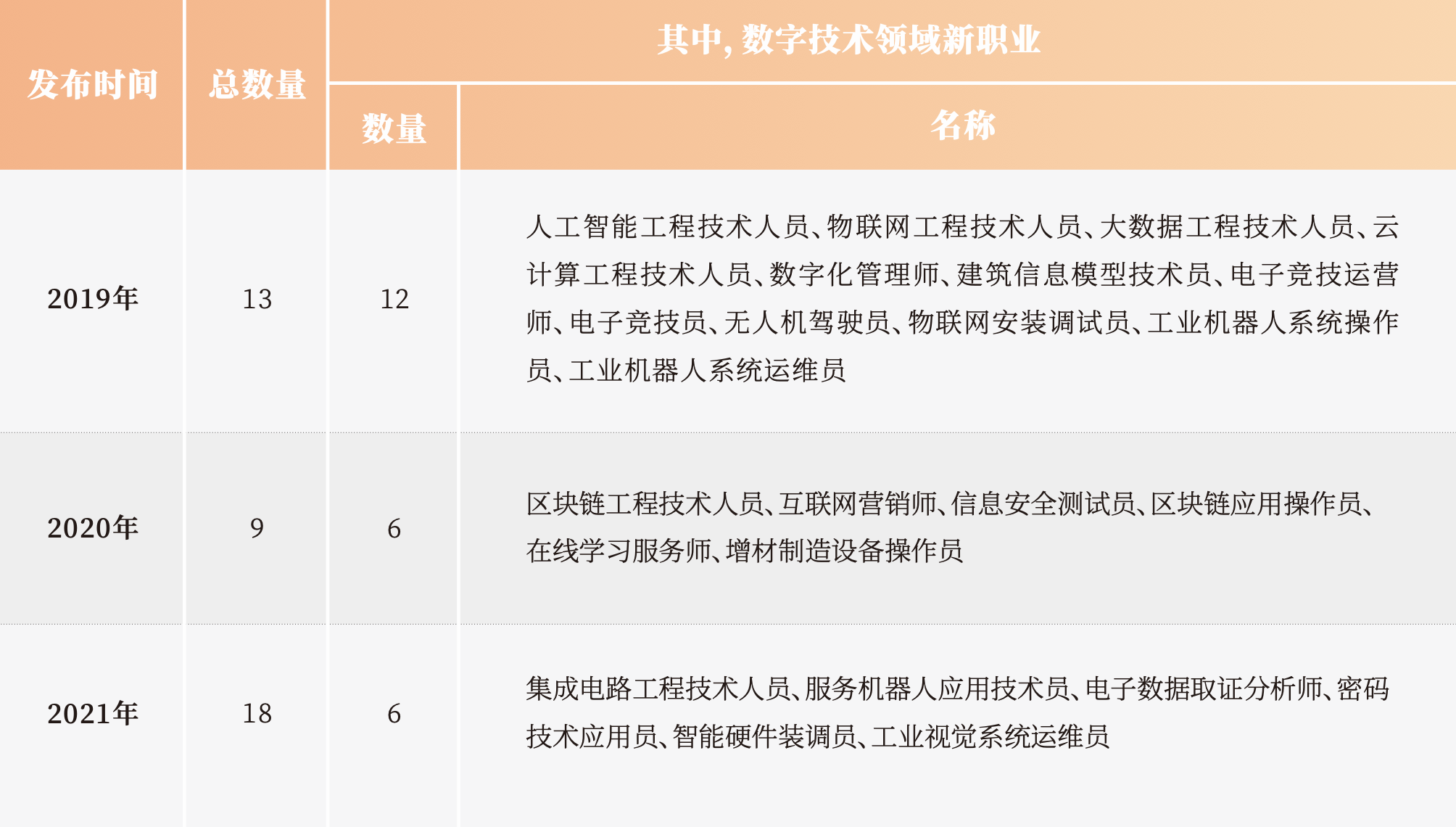 数字技术的广泛应用无疑会创造出新的职业类型,尤其是在数据分析、软件和应用程序开发、网络、人工智能、机器人和3D打印等领域。根据人力资源和社会保障部、国家市场监管总局和国家统计局联合发布的新职业信息,最近三年我国新出现的职业分别有13个、9个和18个。其中由数字技术所创造的占多数,分别为12个、6个和6个。如表1所示。