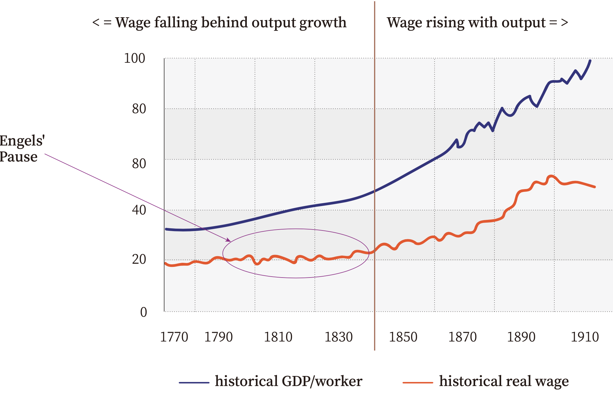 技术变革可以迅速推动经济增长,但并不能立即带来社会工资水平的提高。美国经济史学家Robert Allen(2009)研究发现,英国工业革命一经发生,人均GDP就得到大幅提升,但工资水平在长达半个世纪的时间里几乎没有增长。Allen把这种现象命名为“恩格斯停滞(Engels’ Pause)”。直到1840年之后,英国的工资水平才开始大幅提高,从而呈现出与人均GDP同步增长的趋势。如图1所示。