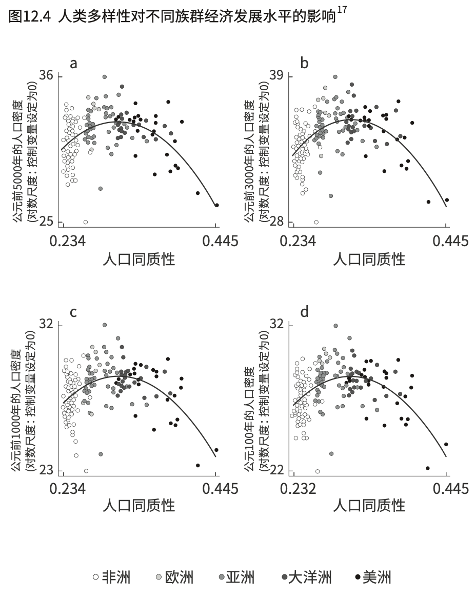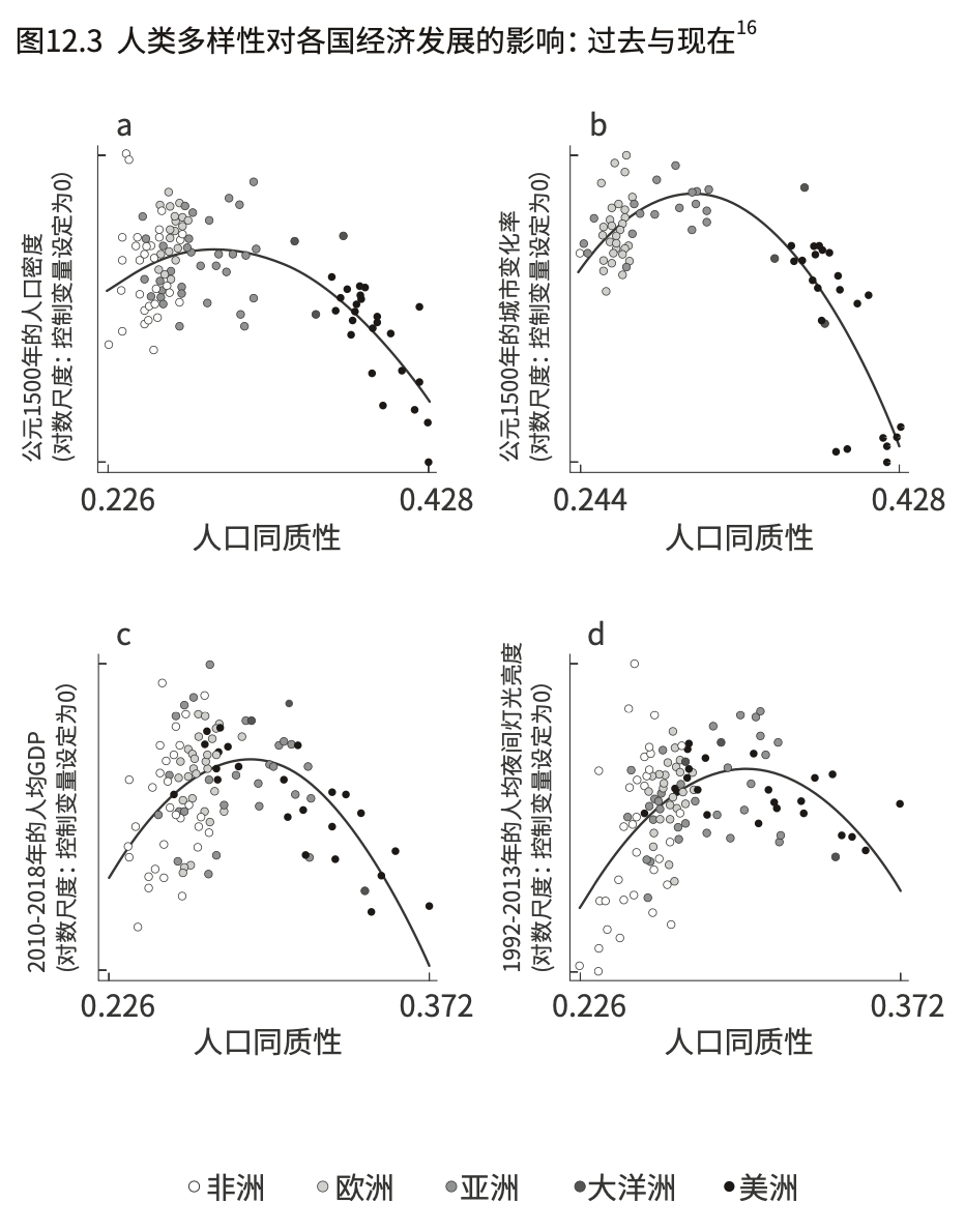 还有,在过去几个世纪中,最有利于经济繁荣的多样性水平区间有所提升。这一现象符合如下假说:在快速变化的技术环境下(发达阶段的特征),多样性的益处变得愈发突出。多样性在发展过程中的重要性提高,有助于解释中国和欧洲命运逆转的原因。在公元1500年左右,日本、朝鲜和中国等国家拥有最适宜经济发展的多样性水平。显而易见,它们相对较高的同质性对社会凝聚力的好处超出了阻碍创新的坏处,这在公元1500年之前的时代是合适的,因为当时的技术进步较为缓慢,多样性能发挥的益处更为有限。事实上,中国确实在前工业化时代相当繁荣。但随着技术进步在之后的5个世纪里加速,中国相对较高的同质性似乎迟滞了它转向现代增长时期,导致经济主导权转移到更为多样性的欧洲及之后的北美洲。目前对于现代经济发展最有利的多样性水平应该接近于美国的现状。