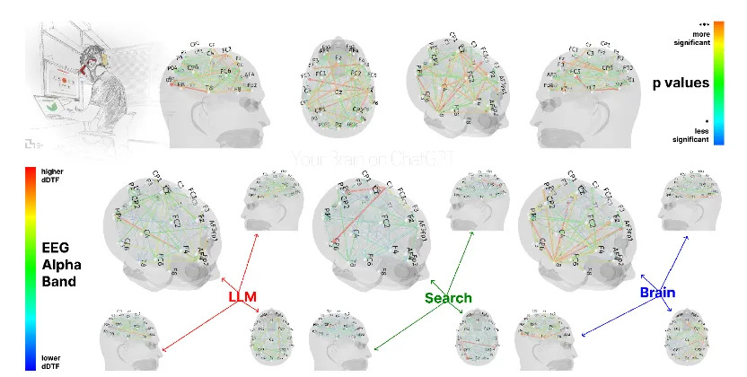 实验由54名被试者参加,发现使用AI工具的人出现了明显的记忆能力下降:LLM组(使用ChatGPT)在即时引用自己撰写的文章时,正确率仅为11.1%,而对照的Brain-only组(不使用AI工具)高达88.9%。实验还发现了被试者脑电波的神经连接减弱:EEG数据显示,LLM组的alpha频段神经连接强度(dDTF=0.009)显著低于Brain-only组(dDTF=0.053),表明AI使用减少了大脑语义整合和注意力调控的神经活动。