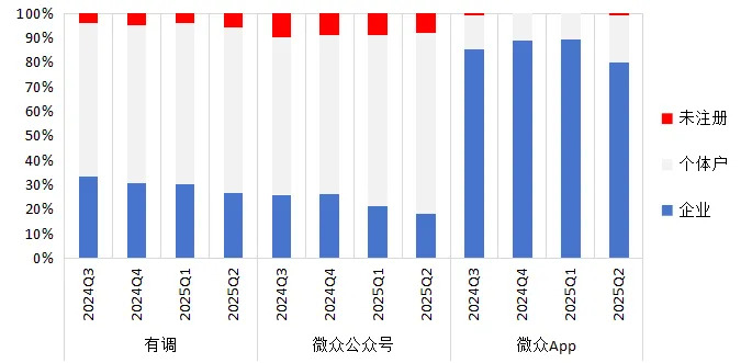 具体的,在样本主体注册类型上,微众App样本注册为企业占比较高,而其他两个渠道样本注册为个体户占比较高(图1)。