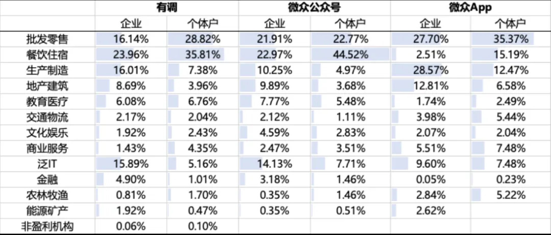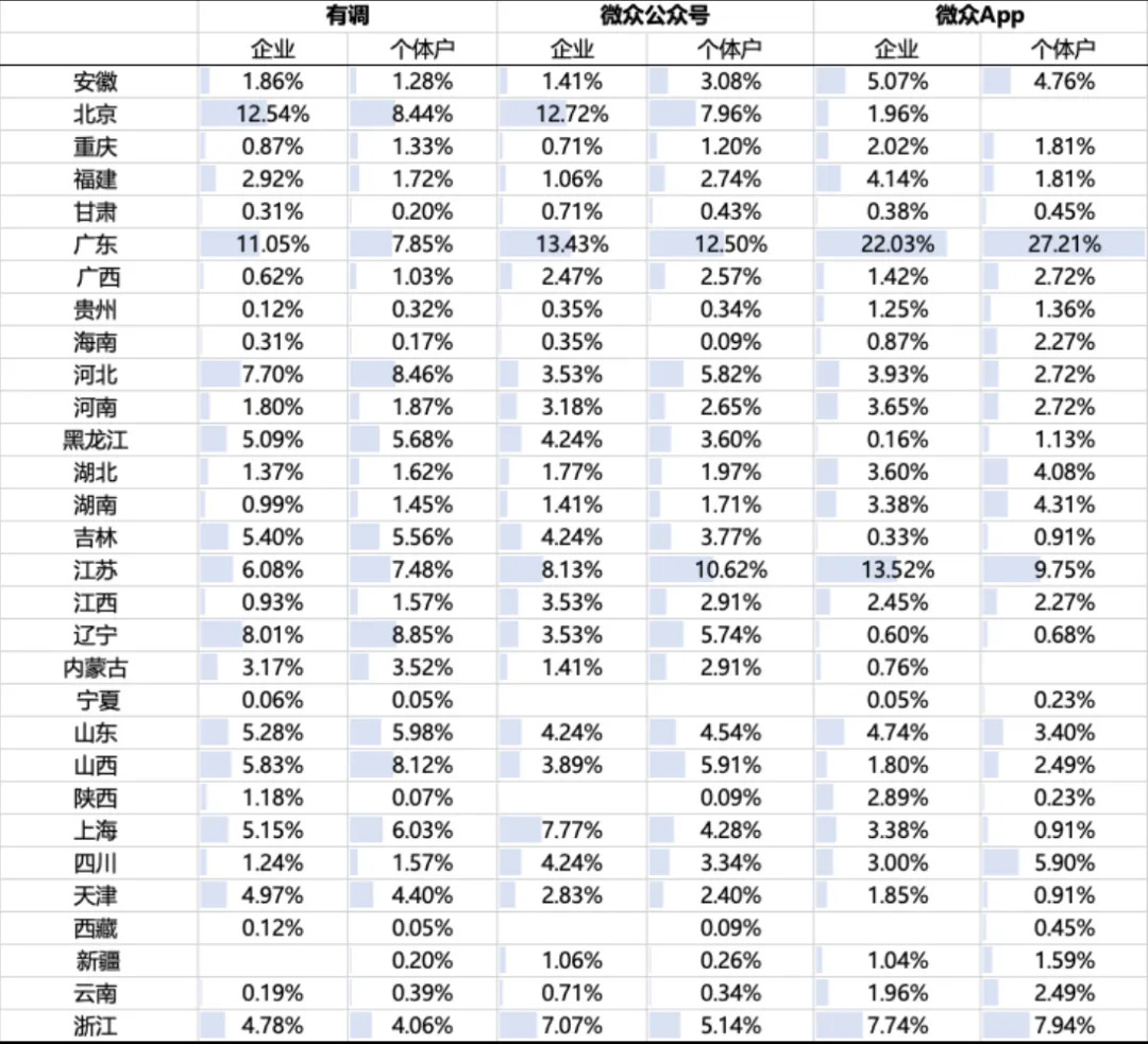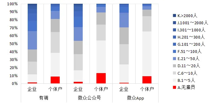 有调样本、App样本和公号样本在企业和个体户占比、规模、行业和地区分布上存在较大差异。三个渠道错位互补,提升了总体的代表性。