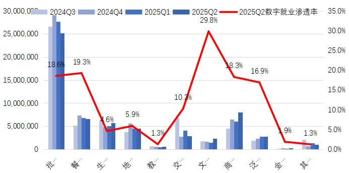 根据估算结果,2024年底全国产业数字化就业总量为6195.1万,占全国就业人员的8.4%。之后这一数字连续下降,至2025年二季度末降至6000.9万,其中企业创造的数字化就业数为2083.1万,个体户创造3917.7万。批发零售业是数字化就业体量最大的行业,2025年二季度为2513.8万,占所有产业数字化岗位的41.1%;文化娱乐业是数字就业渗透率最高的行业,2025年二季度渗透率为29.8%。