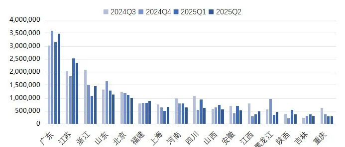 分地区来看,企业创造的产业数字化就业岗位大部分分布在东部沿海省份4。2025年二季度,全国31个省级行政区中,企业带来的数字化就业总量环比上升的共15个,下降的共16个,整体相对平衡。企业创造的数字化就业数量超过100万的省份包括广东(331.1万)、江苏(235.8万)、浙江(145.4万)、山东(113.8万)和辽宁(110.0万)。超过50万的省份(直辖市)包括北京(99.8万)、湖北(92.0万)、河北(90.1万)、福建(89.0万)、上海(65.0万)、河南(63.4万)、四川(62.2 万)、山西(60.0万)、安徽(52.7万)和天津(51.6 万)。超过 30 万的省份(直辖市)包括江西(49.0 万)、黑龙江(46.3 万)、陕西(37.9 万)、吉林(31.6 万)和重庆(30.5 万)。