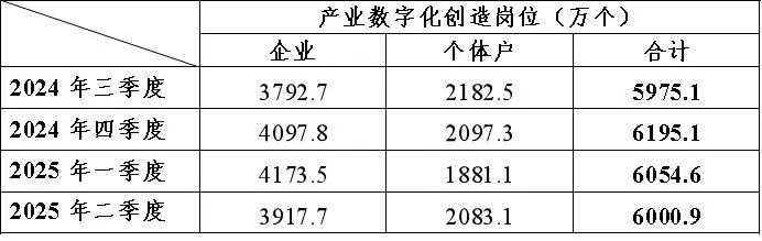 至2025年二季度末,产业数字化就业总量降至6000.9万,较一季度减少53.7万,环比微降0.9%。其中企业的数字化就业岗位数为2083.1万,较一季度增加202.0万,环比上升10.7%;个体户的数字化就业岗位数为3917.7万,减少255.7万,环比下降6.1%(表4)。