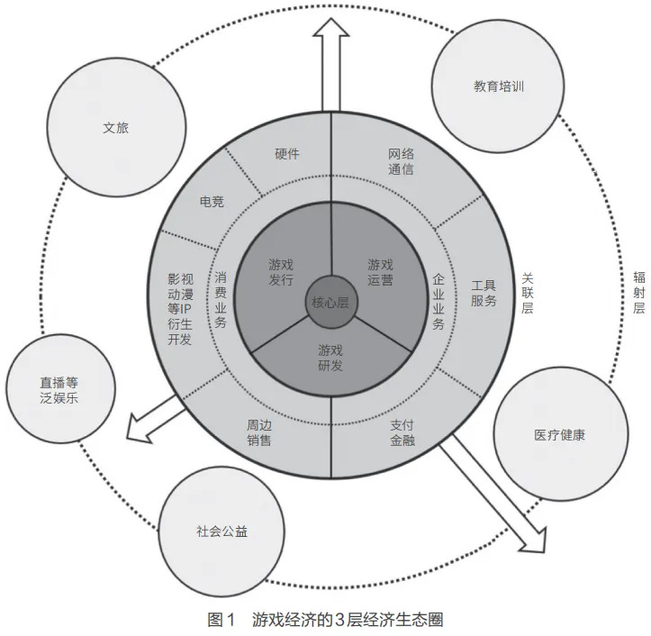 综上,游戏经济是由核心经济层、关联经济层和辐射经济层所构成的一个经济生态圈。其中,核心经济层是游戏本体与直接价值创造,主要有游戏软件与内容的研发、发行、运营;关联经济层是核心价值的直接延伸和放大,主要有游戏硬件外设、电竞产业、影视动漫等IP衍生开发及周边销售等与核心业务强关联的消费业务(ToC),以及网络通信、工具服务、支付金融等企业业务(ToB);辐射经济层是游戏经济的间接影响和跨界延伸,包括文旅、泛娱乐、教育培训、医疗公益等,是游戏产业通过资源协同织就的“生态网”。其结构如图1所示。