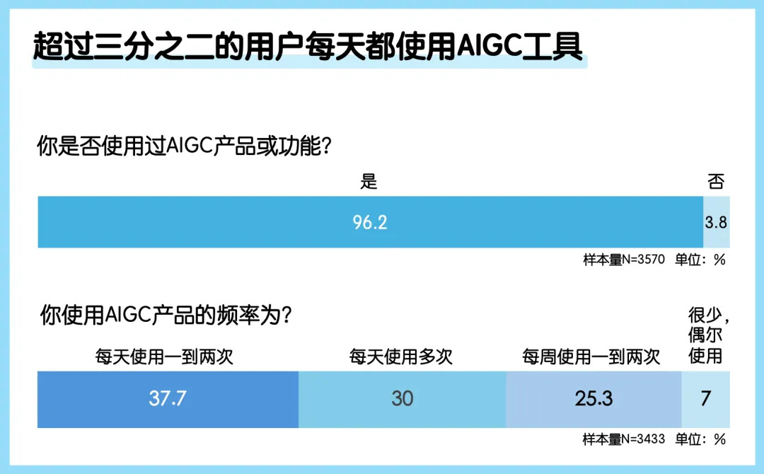 96.2%的调研对象表示他们曾使用过AIGC产品或功能。这一数据表明,AIGC已经跨越了早期门槛,正在成为被主流社会广泛接纳和使用的技术。快速普及的背后,是中国高度发达的数字基础设施和民众对新技术的开放心态。
