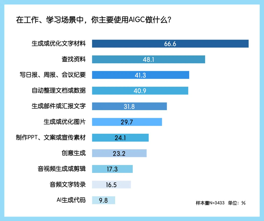 深入探究工作和学习中的具体应用,更能突显AI作为“效率工具”的定位。在所有应用中,“生成或优化文字材料(如文章、报告等)”以66.6%的比例高居榜首,使其成为AI最核心的应用功能。其次是“查找资料“(48.1%)、“写日报、周报、会议纪要”(41.3%)以及”自动整理文档或数据“(40.9%)。这些高频应用功能的共同点在于,它们能够将用户从重复性、流程化的脑力劳动中解放出来。