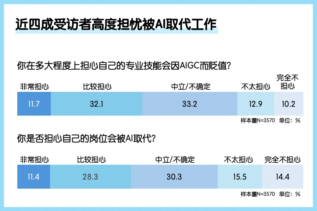 尽管公众热情地拥抱AI作为效率提升的工具,但他们也对其给个人职业生涯带来的长期影响怀有深刻的关切。无论是对自己现有技能的未来价值,还是对工作岗位的长期稳定性,在调研对象中都存在着一种普遍而明显的焦虑感。