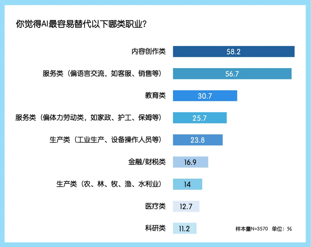 当被问及哪些职业最容易被AI替代时,公众的判断,清晰指向了那些以语言文字处理和模式化沟通为核心的岗位。超过半数的人认为“内容创作类”(58.2%)和“客服、销售等偏语言交流的服务类”(56.7%)等职业最易受到冲击。这与当前生成式AI在文字、图像生成和对话方面的强大能力高度吻合。此外,“教育类(教师、培训)”也被认为是具有一定风险的领域。