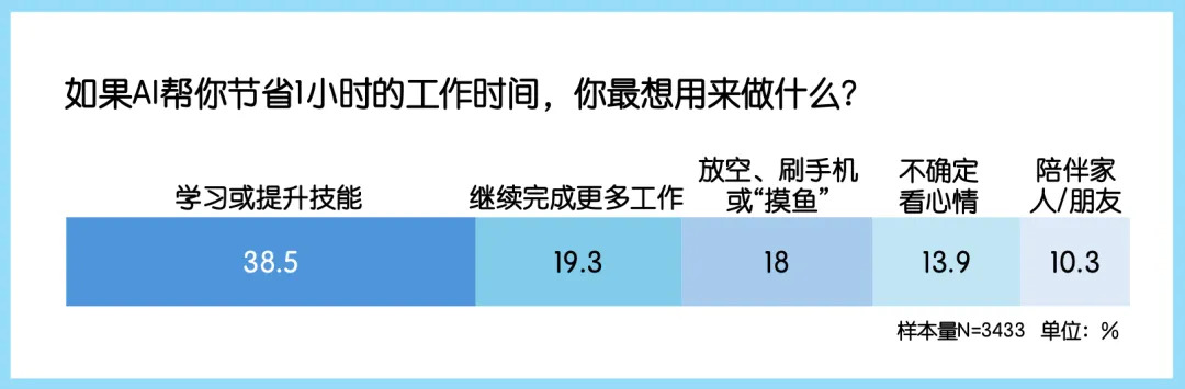 这种普遍的职业焦虑,似乎直接转化为一种强烈的自我提升动机。当被问及“如果AI帮你节省1小时的工作时间,你最想用来做什么?”时,最普遍的回答是“学习或提升技能”。这一选项被38.5%的调研对象所选择,而这一比例几乎是“继续完成更多工作”(19.3%)的两倍,也远高于选择“放空、刷手机或‘摸鱼’”(18%)。