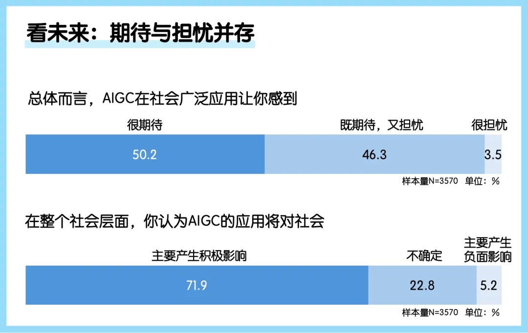 而在这种广泛参与背后,是一种相对复杂,且充满张力的心态:人们既对技术造就的社会进步抱有很高的期望,又对就业前景、信息环境的真实性以及社会公平等问题,表现出深层焦虑。