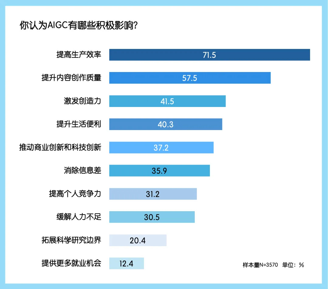 公众所感知到的AI益处,与其作为生产力工具的直接使用体验高度一致。生成式AI被提及最多的积极影响是“提高生产效率”(71.5%)、“提升内容创作质量”(57.5%)和“激发创造力”(41.5%)。此外,人们也认可AI在“提升生活便利”(40.3%)、“推动商业和科技创新”(37.2%)以及“消除信息差”(35.9%)等更宏观层面的价值。