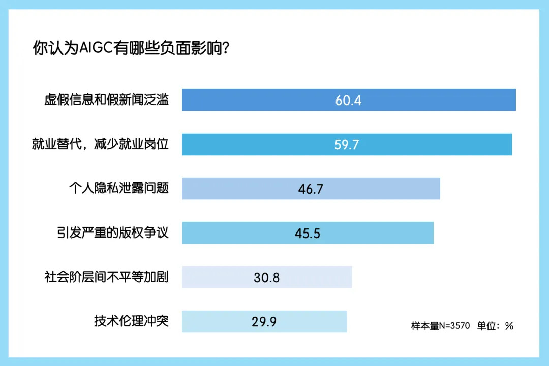 首先是信息生态的污染,60.4%的调研对象担心“虚假信息和假新闻泛滥”;其次是对经济结构的冲击,同样有59.7%的调研对象担心“就业替代,减少就业岗位”;第三是个人权利的影响,46.7%的人担心“个人隐私泄露问题”。此外,“引发严重的版权争议”(45.5%)和“加剧社会阶层间不平等”(30.8%)也是突出的担忧点。