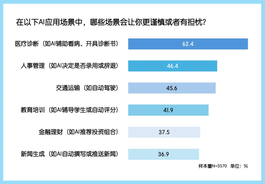 超过六成(62.4%)的调研对象,对AI在“医疗诊断(如AI辅助看病、开具诊断书)”中的应用更谨慎或担忧。这反映了公众对将生命健康这样至关重要的决策权部分或者全部地交予AI,感到深切不安。紧随其后的是“人事管理(如AI决定是否录用或辞退)”(46.4%)和“交通运输(如自动驾驶)”(45.6%)。前者触及了社会公平和个人职业命运的敏感神经,后者则直接关乎人身安全。