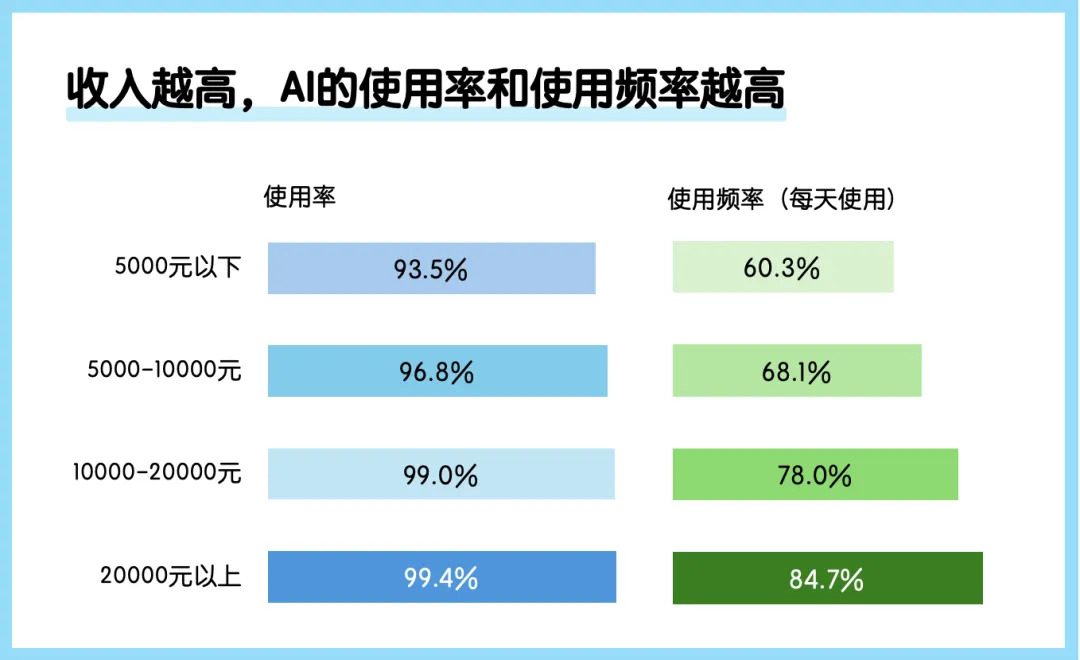 同样,我们发现,收入水平也跟生成式AI的使用率和使用频率存在正相关关系。在有收入群体中,收入越高,AI的使用率越高,使用频率也越高。