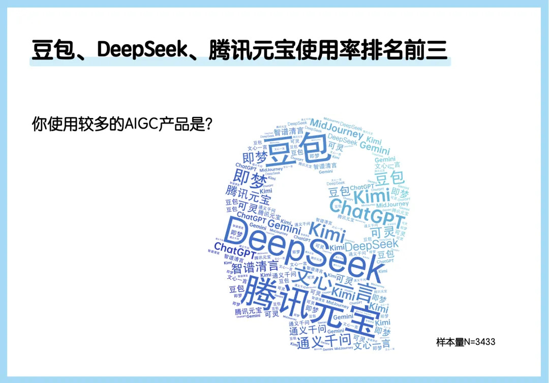 在具体的产品选择上,市场呈现出鲜明的本土化特征。使用率排名前三的产品,均为中国本土公司开发:包括豆包、DeepSeek和腾讯元宝。ChatGPT与Gemini等产品,在本次调研中的用户基数相对较小。