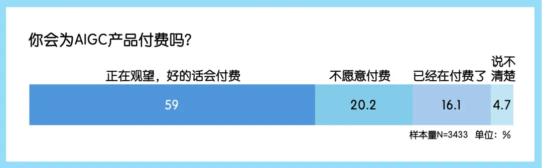 公众普遍将AI视为一种强大的生产力工具,大多数人使用它来完成文本生成、信息检索和内容优化等任务。虽然多数人对于为这些服务付费持开放态度,显示出市场潜力,但他们对价格仍然敏感,百元人民币以下的月度订阅是主流选择。