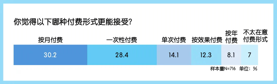 在愿意付费或观望的用户中,“按月付费”(30.2%)和“一次性付费”(28.4%)是接受度最高的两种形式。“按月付费”的偏好与当前流媒体服务的订阅模式高度一致,用户对此模式已非常熟悉。它提供了较低的进入门槛和灵活的退出机制,有利于吸引用户尝试付费服务。“一次性付费”的高接受度,可能反映了部分用户希望“买断”软件所有权的消费心理,避免长期订阅带来的持续性支出。这为提供“终身会员”或特定功能包的永久授权提供了市场空间。