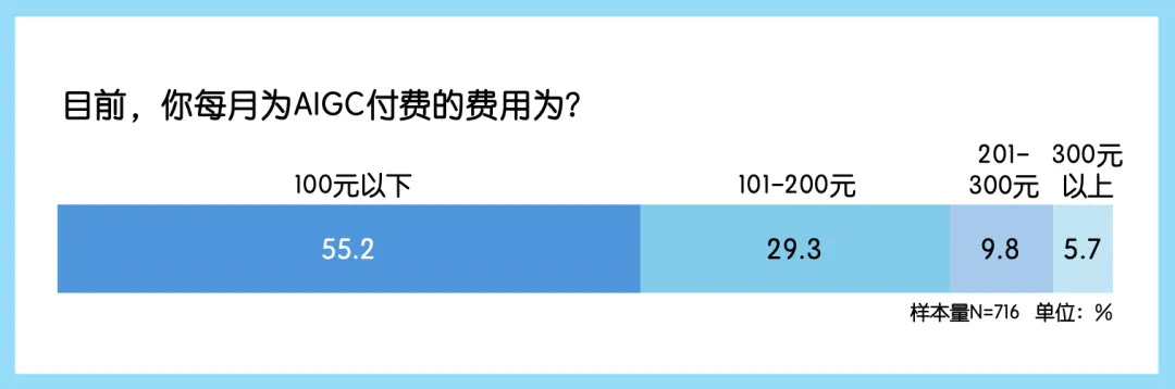 在已付费用户中,55.2%的月费在“100元以下”,29.3%在“101-200元”,高额付费用户占比较小。这表明当前大众消费市场对AIGC产品的心理价位与主流的视频、音乐会员订阅服务类似。将价格设定在百元以内,特别是50元左右的区间,可能是吸引大量用户付费的“甜点区”。