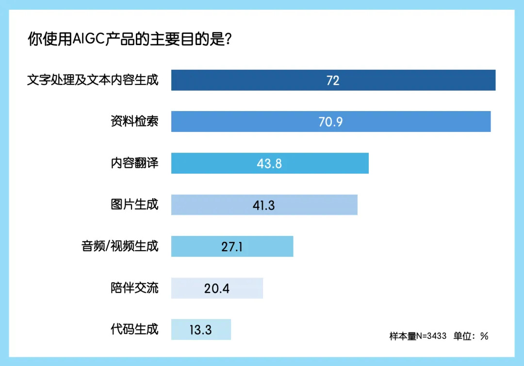 公众使用AI的动机清晰地指向了实用主义。当被问及主要使用目的时,排名前两位的分别是“文字处理及文本内容生成”(72%)和“资料检索”(70.9%)。这两项都与提高信息处理和知识工作的效率直接相关。这些核心功能最常被应用于“学习”(75.7%)和“工作”(70.6%)两大场景中。