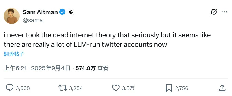 我从来都没有把“互联网已死”理论看作大事儿,但在现如今,似乎确实有很多大语言模型驱动的Twitter账户正在运行。——Sam Altman个人推文,2025/9/4